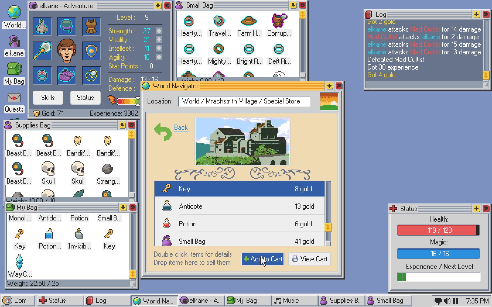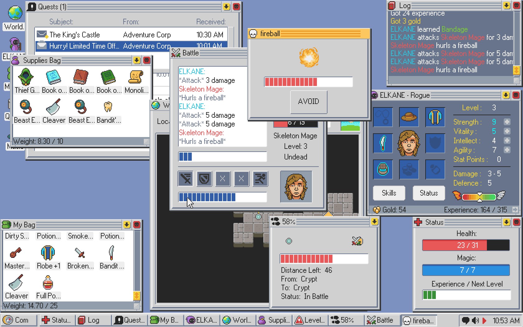 예를들면 몬스터를 공격할 수 있는 화면이 계속 아래위로 움직여서 공격을 클릭하기 힘들게 한다거나, 공격을 맞으면 물약이 들어있는 가방의 화면이 닫혀 물약을 먹으려면 재빨리 가방을 다시 열어서 먹어야 하고, 때론 재빨리 지나가는 화염구나 화살의 피하기(AVOID)를 클릭하여 데미지를 입는 일을 방지해야한다.
