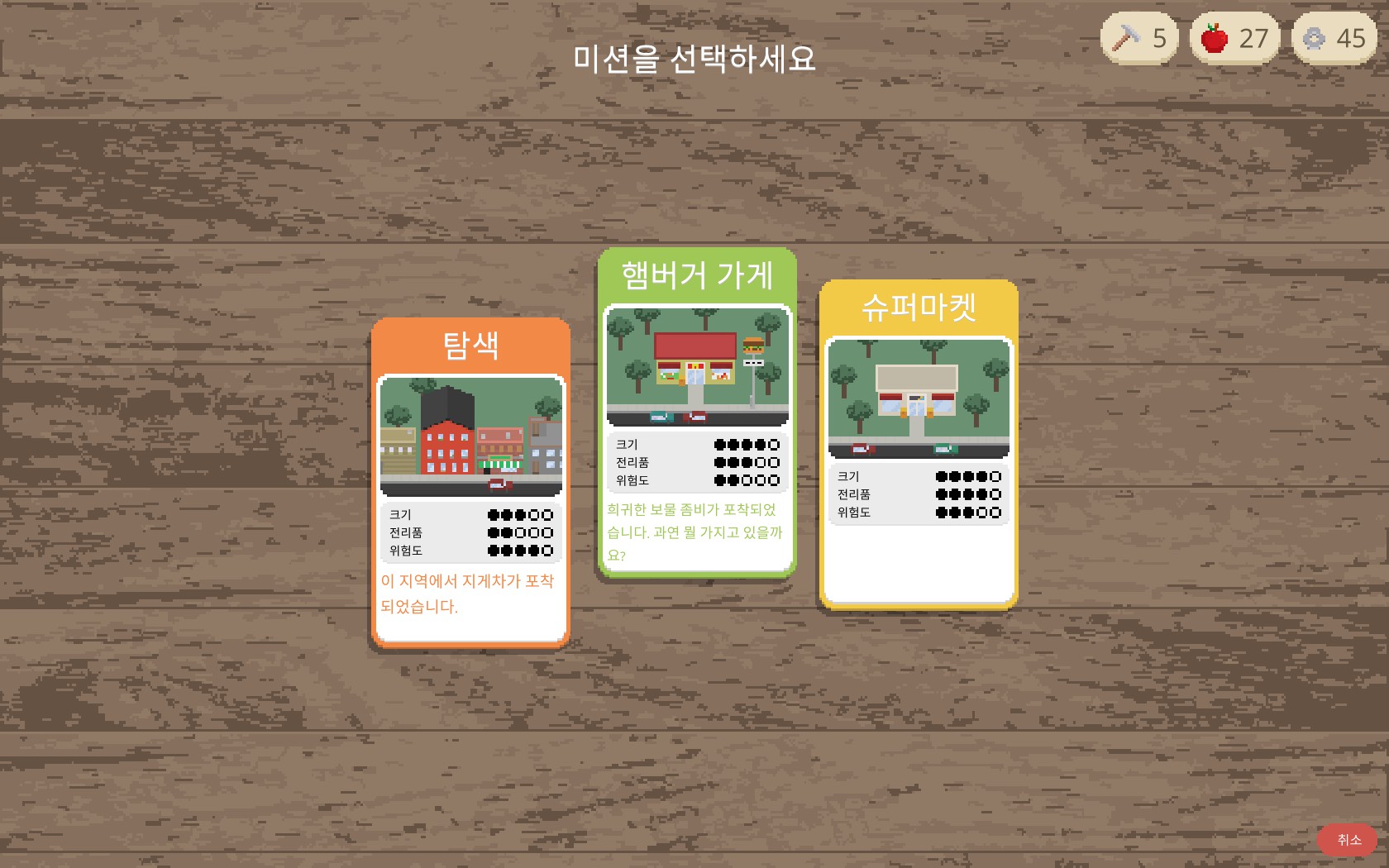 탐색에서 가장 큰 위험은 단계적으로 상승하는 좀비의 위협도와 낮시간이 지나 밤이 되어버리면 대규모로 몰려오는 좀비떼를 상대해야 한다는 거다. 빠르고 능률적인 행동으로 목표를 우선 처리하고 여분의 시간으로 자원을 수집하여 밤이 깊어져 점점 더 강한 좀비와 대규모의 좀비가 몰려오기 전에 탈출하는 컨트롤이 필요하다.