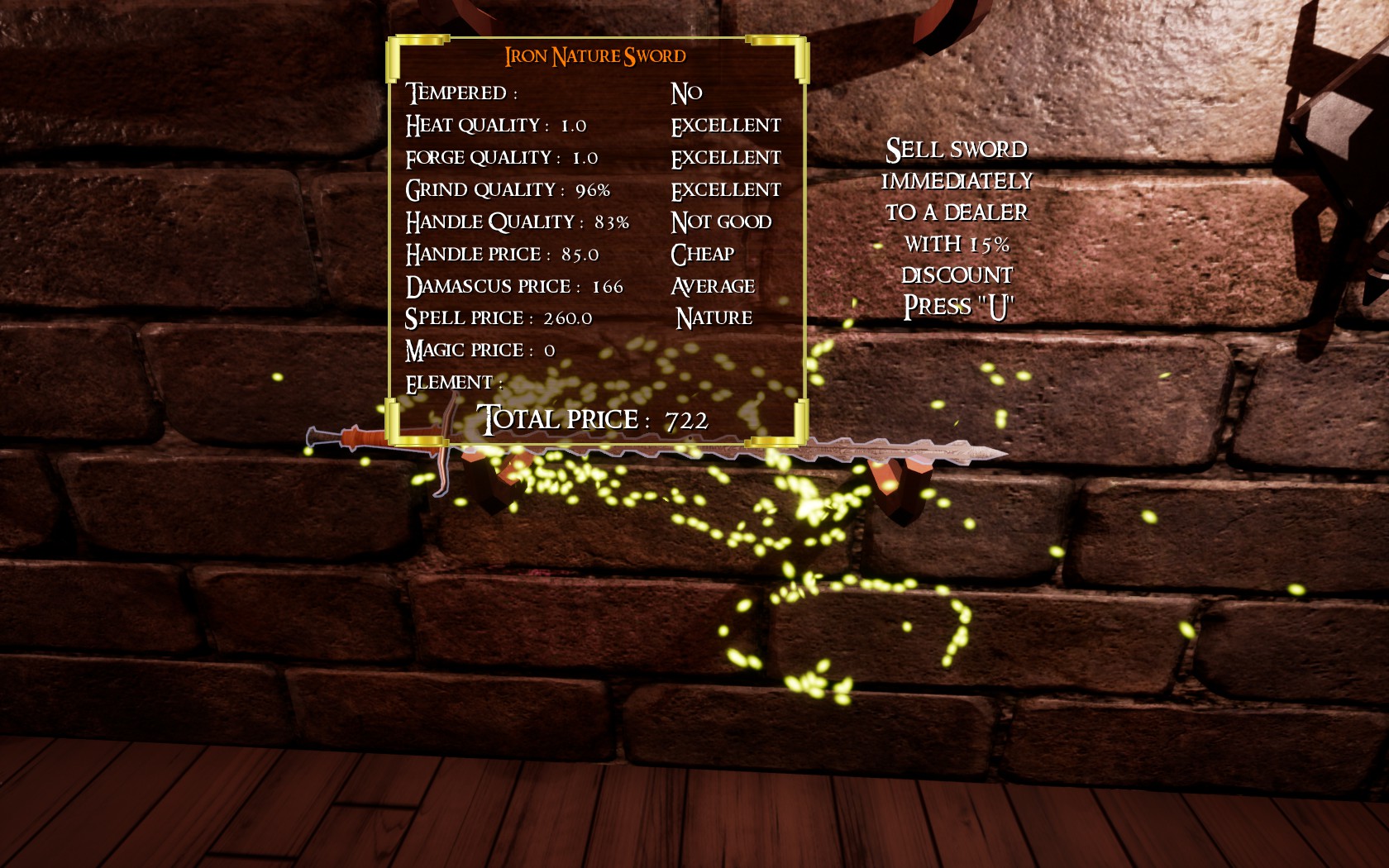 단순한 자동제작이 아니라 게이머는 상점에서 잉곳을 사서 용광로(furnace)에서 녹여 모루에다가 얹어두고 망치로 두들기는 단계를 통해 검 한자루를 제작해야한다. 온도의 조절과 망치질의 완벽도 손잡이의 마감, 숫돌로 날을 얼마나 잘 갈았느냐에 따라 가격이 달라지고 완성도가 높으면 높을 수록 판매가가 올라가는 시스템을 갖췄다. 너무 완벽할 필요는 없으나 제작 완성도가 너무 떨어지면 원가보다 훨씬 못한 가격으로 팔아치워야 하기에 매번 찾아와서 검을 갈아달라거나 손잡이를 고쳐 달라는 손님들의 요구를 들어주며 자금을 관리해야 한다.