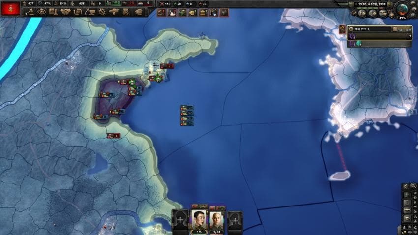 소련이 베이징 근처까지 오면 슬슬 전투 참여해서 전선을 이어주거나 베이징 라인을 비우고 소련쪽 전선으로 해상 이동을 해주세요. 인력이 쌓이기 시작하는 시점이니까 괴뢰국 사단을 좀 더 뽑아줍시다.