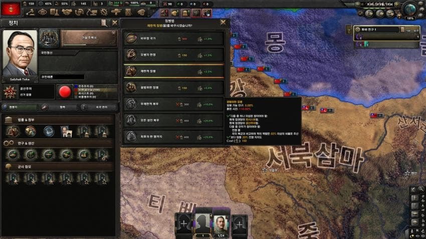 정치주력 중점이 찍히면 정치력 조금 더 모아서 정치력 장관을 임명하고, 이후 73까지 모아서 중국에 정당화를 넣으세요.