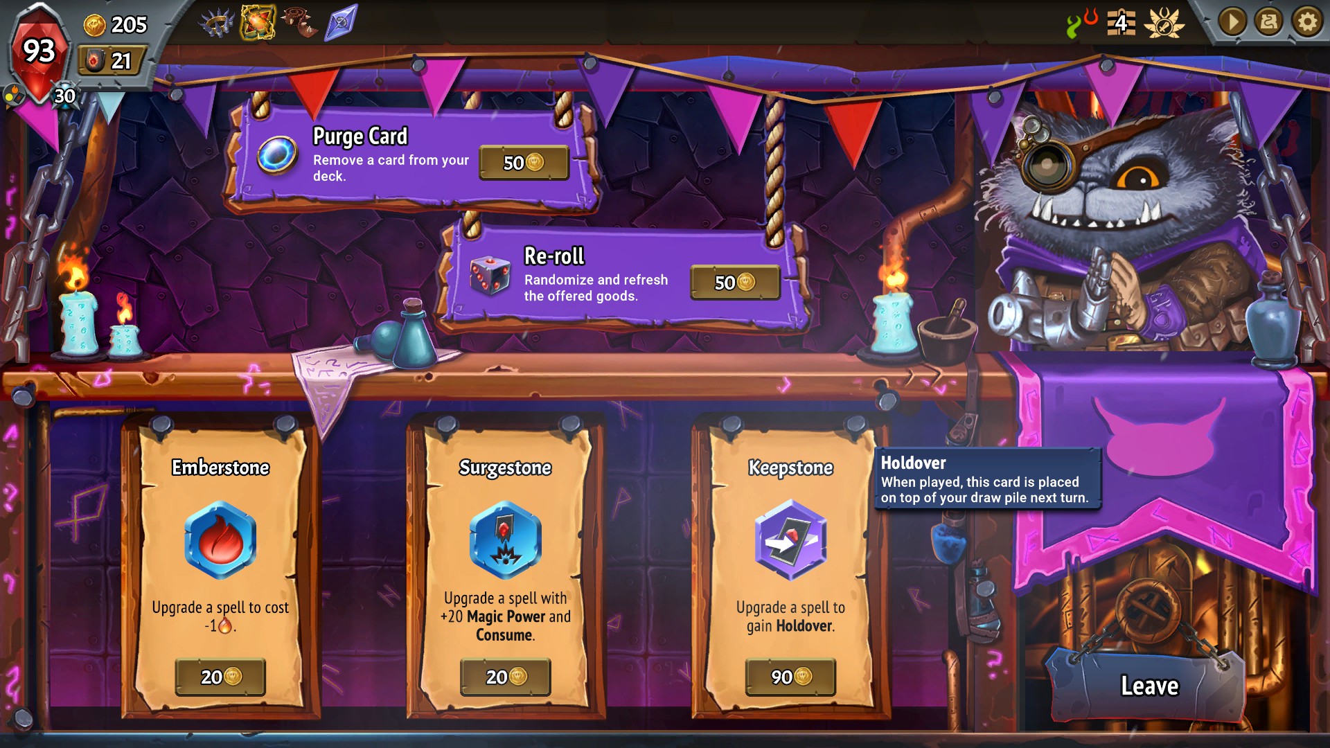 유물도 얻을 수 있는 길이 많지 않다. 캐릭터 업그레이드와 스펠 업그레이드와 비교하여 얼마나 강력한 유물을 얻을 수 있는지가 클리어를 할 수 있느냐 없느냐를 가르기에 유물이 가장 우선이고 그다음이 몬스터 업그레이드, 스펠은 가장 뒷전으로 밀릴 수 밖에 없다. 시쳇말로 코스트 사기를 칠 수 있는 방식이 한정되어 있기에 잘 풀릴땐 한없이 잘 풀리고 안 풀리면 어떻게 해도 클리어 할 수 없다.